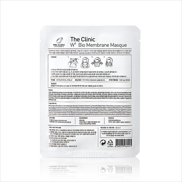 Whitening과 Wrinkle Free 두 가지 기능을 겸비해 W²라 명명한 이 마스크팩은 THE CLINIC 코스메틱의 안티에이징 성분을 듬뿍 담은 제품입니다.